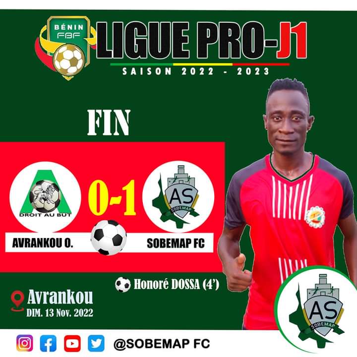 Victoire étriquée ! (0-1), c’est le score qui a sanctionné cette rencontre entre Avrankou Omnisports et Sobemap FC. Engagés avec une folle envie de gagne, les Manutentionnaires ont mis les pieds sur l’accélérateur et obtiennent un coup franc bien placé dans l’angle droit de la défense adverse. Le défenseur axial Honoré Dossa, spécialiste en la matière, s’invite dans exercice appliqué et ouvre le score pour le club de la Société Béninoise des Manutentions Portuaires (Sobemap). (0-1) à la 4è minute de jeu. Le public des supporters de Sobemap FC s’enflamme et la fanfare résonne en exponentielle. Les occasions s’enchaînent, les actions se multiplient, Ibrahim Ogoulola et ses coéquipiers circulent le ballon dans tous les espaces du terrain.  Dans cette aisance technique, le gardien de but Steve Glodjinon manque son dribble qui aurait pu coûter cher aux Manutentionnaires. Heureusement, le montant droit sauve l’égalisation. Du retour des vestiaires, l’avant-centre Bio Odo Chabi, éblouissant dans ce match, passe tout près du break. Sur un coup franc mal repoussé par le gardien d’Avrankou, Bio Odo Chabi a manqué de plonger sa tête pour signer le deuxième but des Manutentionnaires. Les assauts offensifs des joueurs d’Avrankou omnisports ont été neutralisés par la charnière défensive bien groupée de Sobemap FC. Même la dernière action des locaux sur un coup franc bien placé à la lisière de la surface de réparation n’a pu trouver le cadre. Ainsi, l’arbitre de la partie fait retentir le dernier coup de sifflet qui marque la fin de cette rencontre. Sobemap FC signe sa première victoire de la saison et se projette déjà sur son prochain match face à la Jsp.